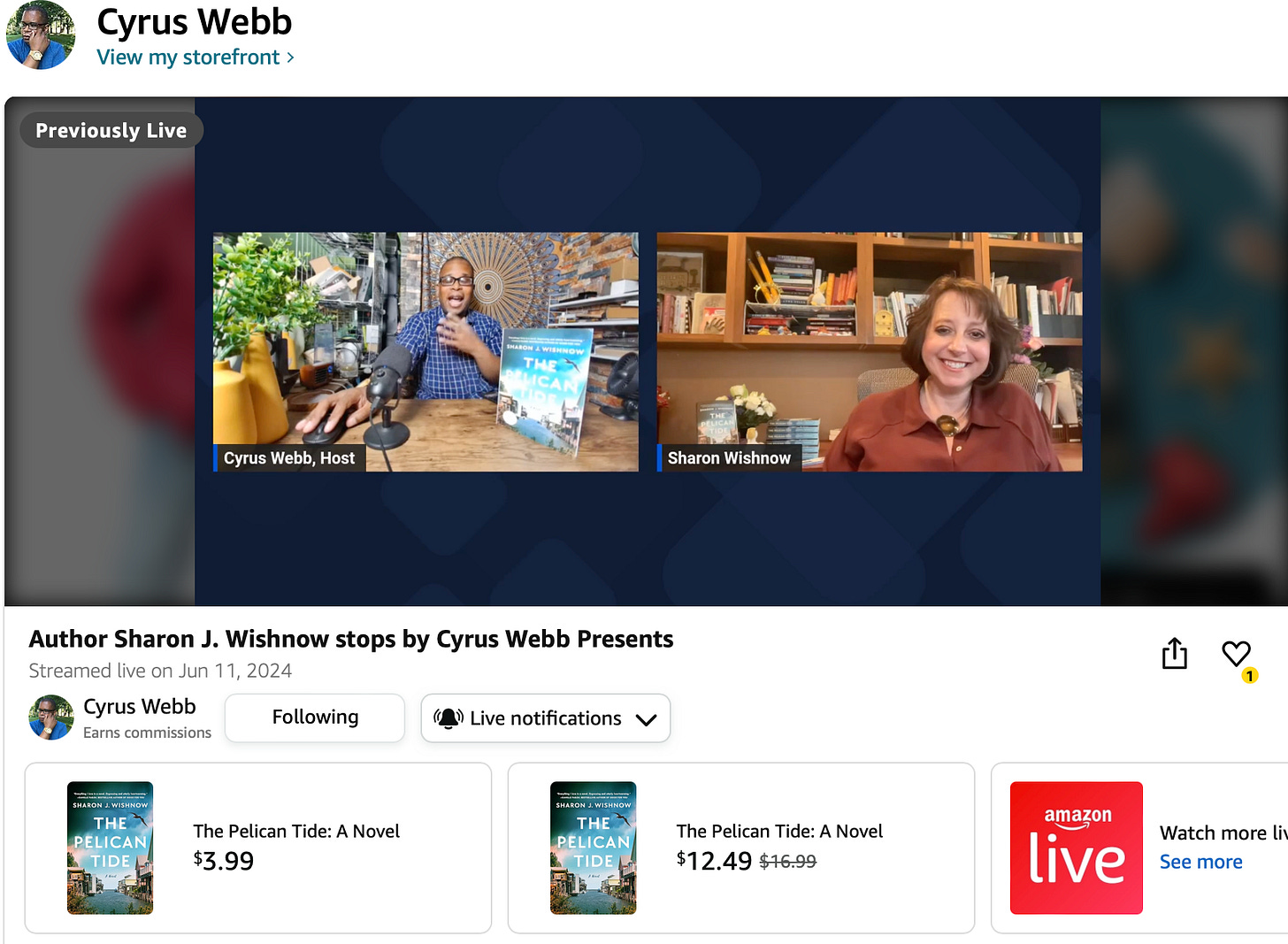 Cyrus was the best interview I’ve done to date. He had read the book and was 100% engaged with the story. He’s a Mississippi native and had lived through the Gulf oil spill. We had a thoughtful talk about the book both before and after the show. (This in contrast to a radio interview I did the previous week where the host hadn’t read my book and introduced me three times as Sharon Winslow - not my name.) Cyrus also had me back for his Friday podcast.